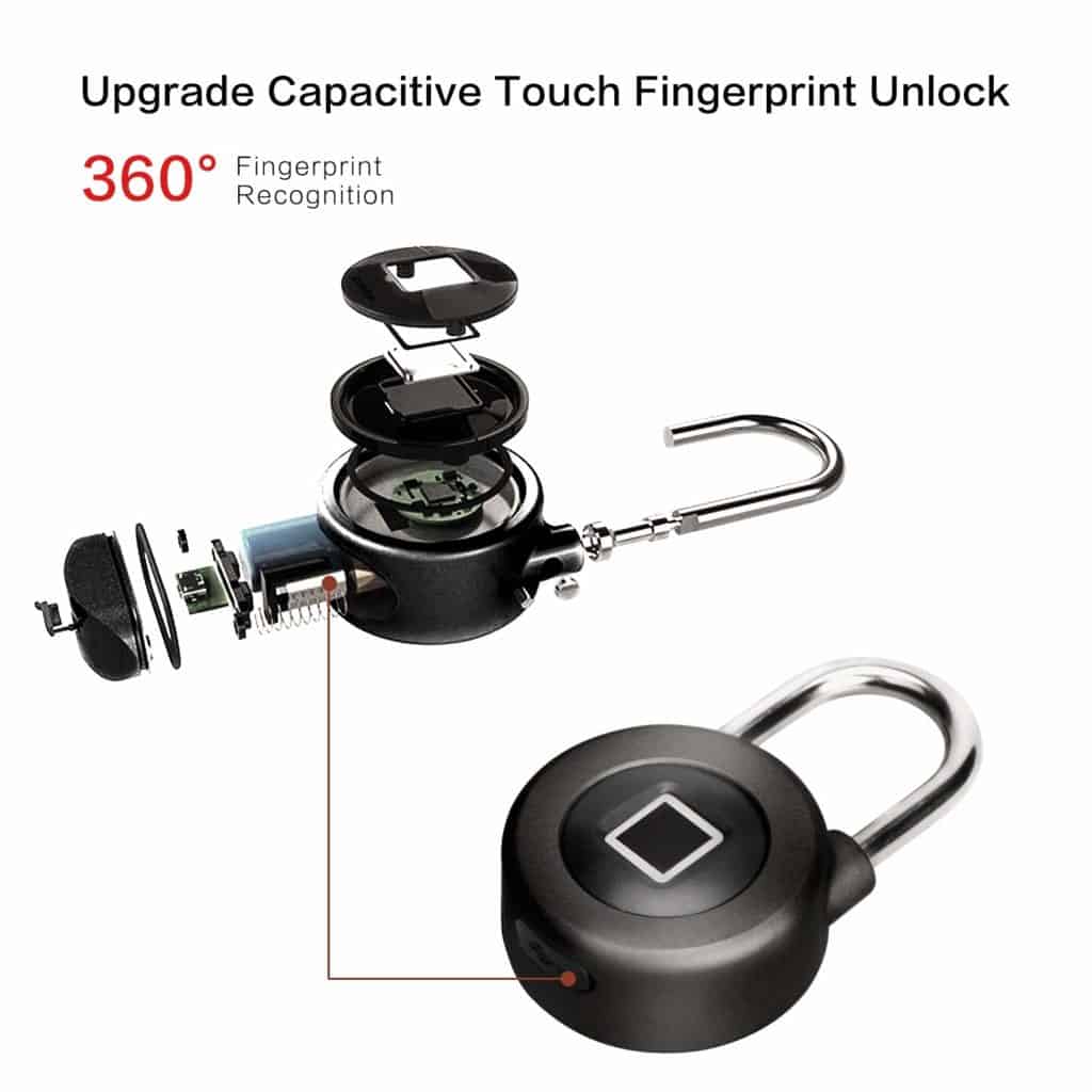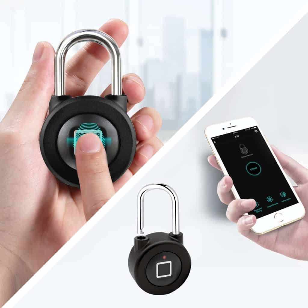This padlock uses a fingerprint scanner as the unlock mechanism instead of a key or combination. It can store up 15 fingerprints at once. It it is dustproof, and waterproof.